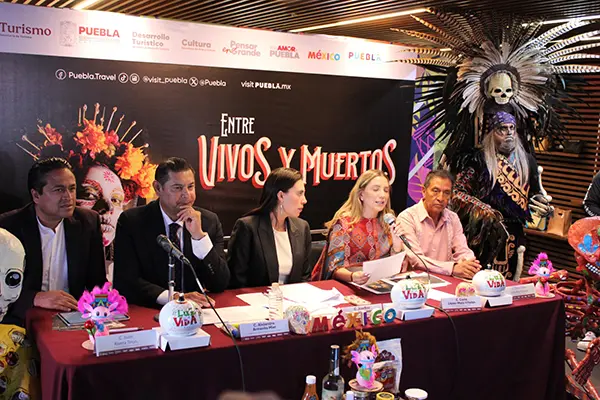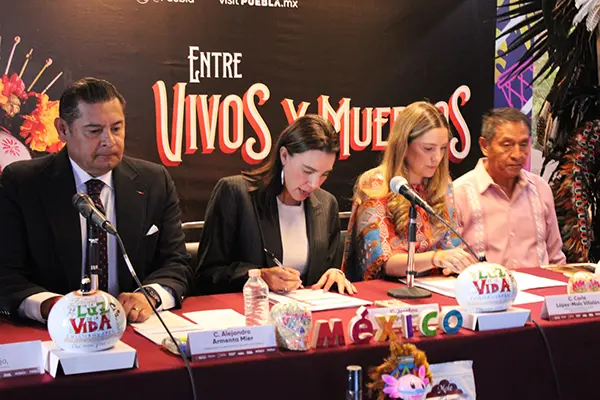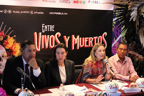 Este martes, el gobernador de Puebla, Alejandro Armenta, y la secretaria de Turismo, Josefina Rodríguez Zamora, presentaron en la sede de la Secretaría de Turismo federal en la Ciudad de México la edición 2025 del festival Entre Vivos y Muertos, un evento que reúne y celebra todas las festividades del Día de Muertos que organizan los municipios del estado.