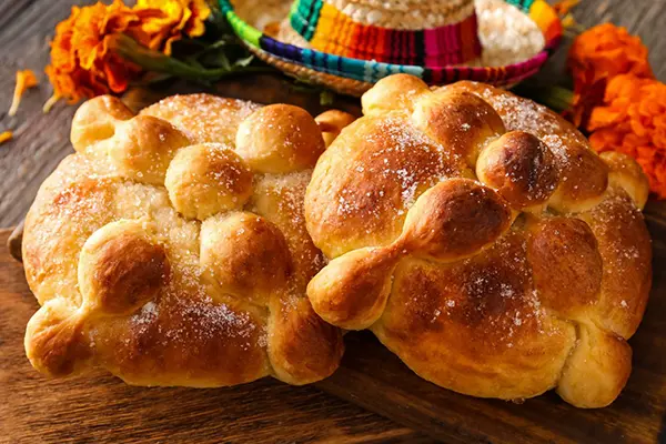 La forma tradicional del Pan de Muerto —redonda, espolvoreada con azúcar y decorada con tiras de masa— está cargada de significado. Su estructura circular alude al ciclo eterno de la vida y la muerte; la bola central simboliza el cráneo del difunto.